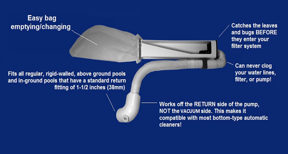 The Pool Python installs in minutes and operates whenever your pump is running. Leaves, hair, bugs, grass cuttings all are eaten BEFORE they enter your filter system or sink to the bottom. The Pool Python is a quality product, well constructed using the best local materials and long-lasting reusable bags.